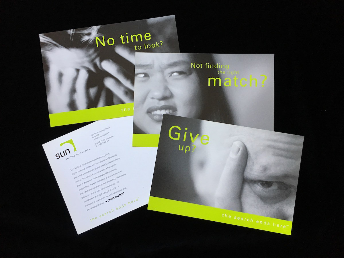 Direct-mail marketing pieces and identity refinement for a creative recruiting firm in Chicago Nicknamed “head-hunters,” creative recruiters specialize in pairing skilled & tech-savvy talent with creative teams of all sizes—from temporary freelance assignments to full-time permanent positions. The real talent is finding just the right match.